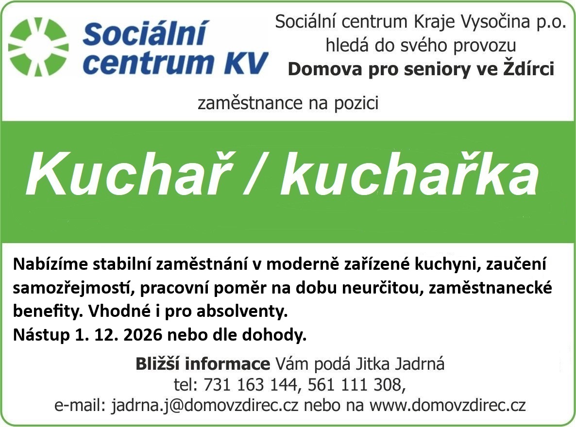 Nástup je možný od 1. 12. 2026 nebo dle dohody. V případě zájmu kontaktujte Jitku Jadrnou, vedoucí kuchyně, na telefonech 731 163 144, 561 111 308 nebo e-mailu jadrna.j@domovzdirec.cz.