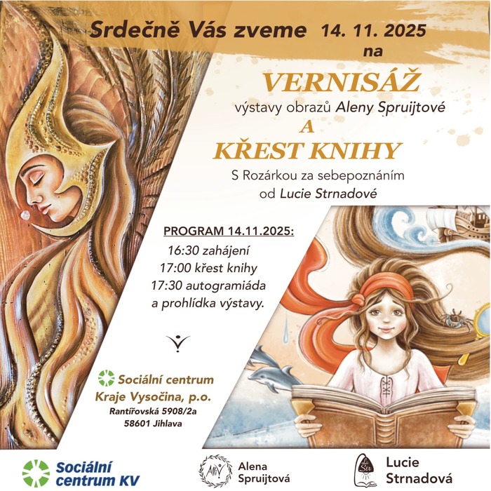 Srdečně vás zveme na výjimečné odpoledne plné umění, inspirace a literatury. V Kavárně Sociálního centra Kraje Vysočina v pátek 14. 11. 2025 společně oslavíme dva krásné milníky – vernisáž výstavy AlliV Aleny Spruijtové s názvem Andělská a křest knihy Lucie Strnadové S Rozárkou za sebepoznáním.