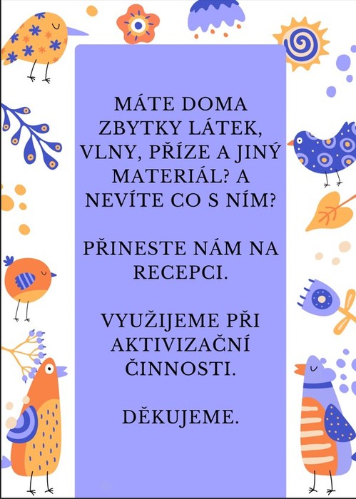 Provádíte jarní úklid a zbývají vám věci, které už nepoužíváte, ale je vám líto je vyhodit? V Sociálním centru Kraje Vysočina uvítáme pro naše šikovné uživatelky i uživatele jehlice, háčky, korálky, stuhy, bavlnky, nedopletené svetry, tkalcovské stávky... Prostě všechno, co potěší tvořivé oko a zaměstná ruce, které nejsou zvyklé ležet v klíně.